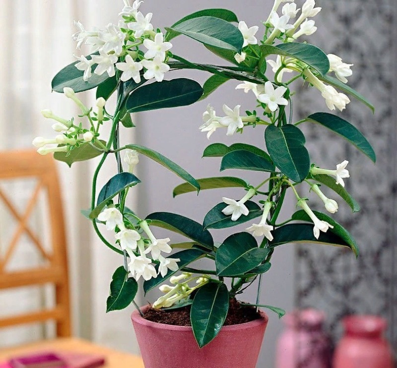 Тропическая лиана с удивительно красивым сочетанием темно-зеленой листвы и белоснежных цветов. В домашних условиях распространяет вокруг себя нежнейший тонкий аромат. Он похож на благоухание садового жасмина.