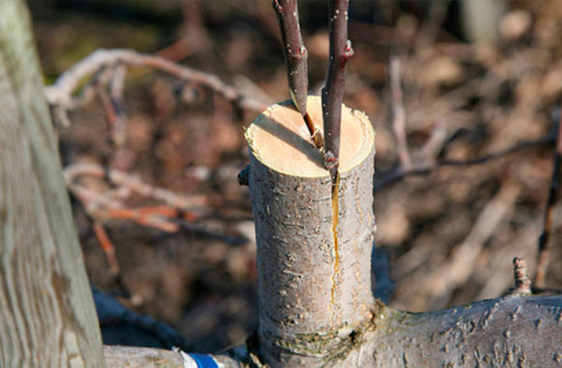 Прививка «на пенёк» производится за кору или в расщеп живого пенька. Прививка лучше приживётся, если сделать её к черенку скелетной ветки.
