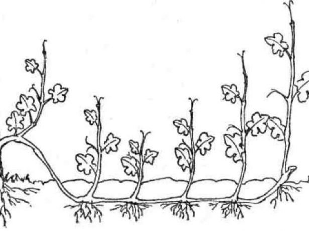 - Отводки. Побег длиной не менее 3 метров укладывают в борозду глубиной 5 см, пришпиливая в узлах. Плеть укрывают землёй, оставляя зеленые листья на поверхности почвы. Тщательно поливают и ждут укоренения.